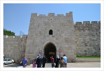 7) 다메섹 문(Damascus Gate): 예루살렘 북쪽 성벽 중앙에 있다. 이 문의 히브리어 이름은 ‘샤아르 셰켐’(Sha'ar Shechem)인데, 문자적으로 ‘세겜의 문’이다. 왜냐하면 이 문이 예루살렘 북쪽에 있는 세겜으로 향하고 있기 때문이다. 아랍어 이름 ‘밥 엘 아무드’(Bab el-Amud)는 ‘기둥의 문’이라는 뜻이다. 로마인들은 도로를 만들면서 거리를 측정하는 이정표를 세웠는데, 다메섹 문 안쪽 중앙 플라자에 기둥을 세워 유대 지역의 영점을 표시한 데서 이런 아랍어 이름이 붙은 것으로 보인다. 이 다메섹 문은 16세기 오스만 터기 제국 술레이만이 두 개의 옛 문(헤롯 대왕이 지은 문과 로마 황제 하드리아누스가 지은 문) 위에 세운 것이다.