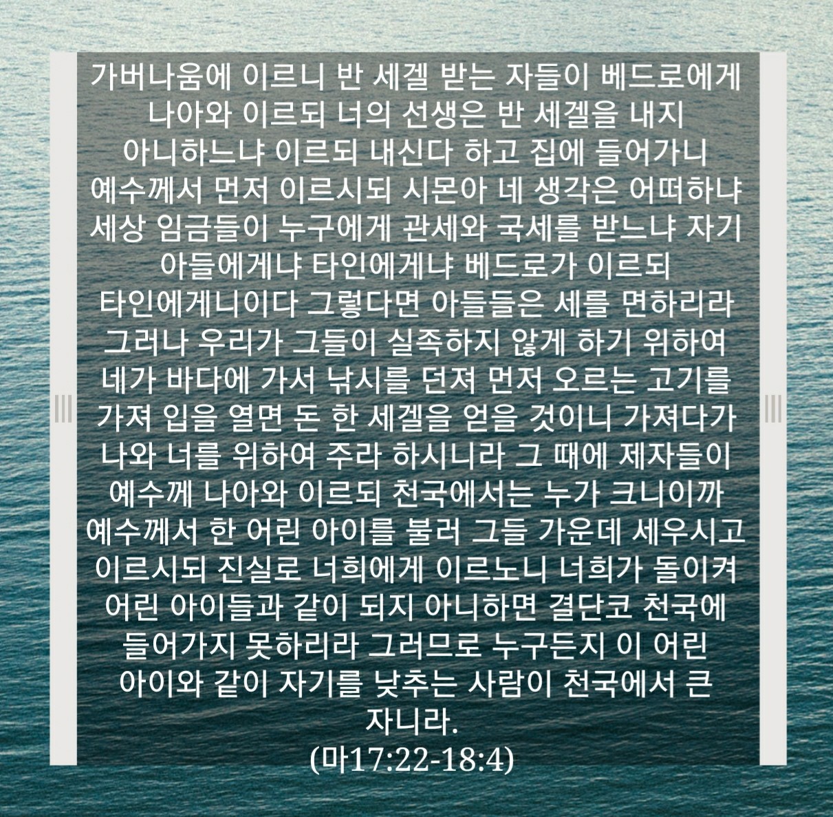 여기서 예수님의 말씀을 기독교인들은 하나님의 자녀이므로 나라에 세금을 내지 않아도 된다는 식으로 해석을 하는 것도 곤란하고, 금화가 든 고기를 낚기 위해서 날마나 바다에 가야 한다는 식ㅇ으로 해석해도 곤란합니다.