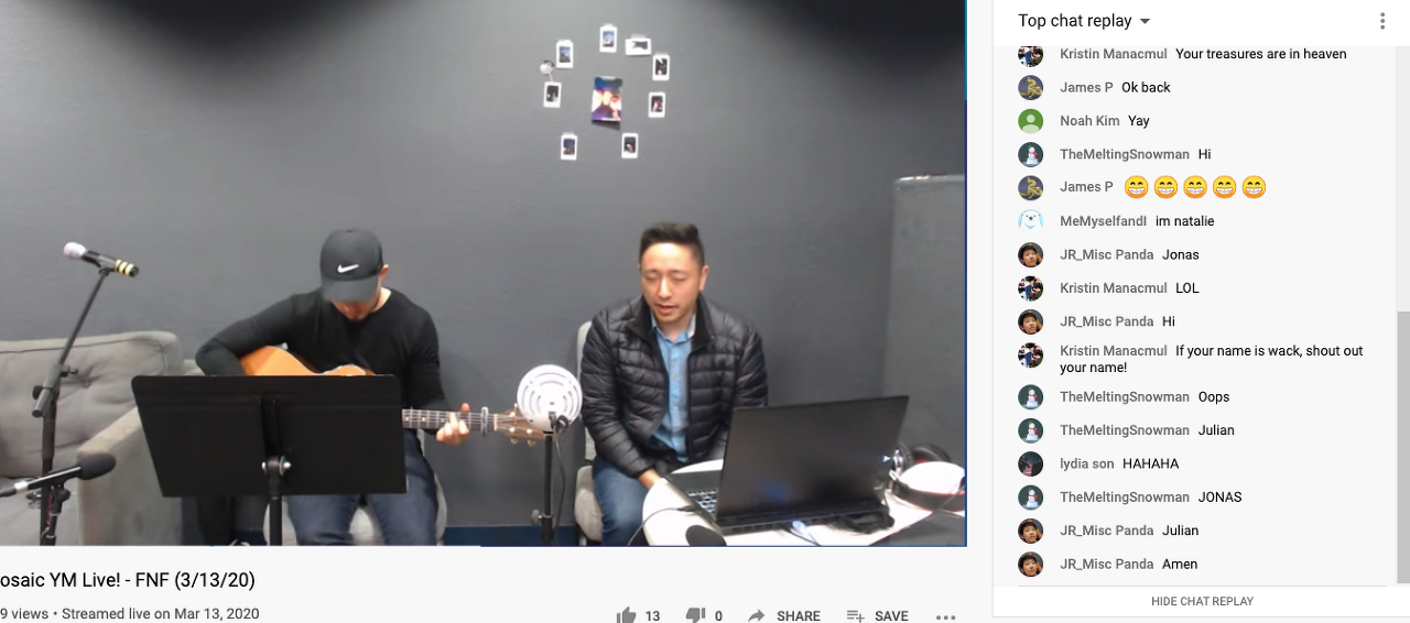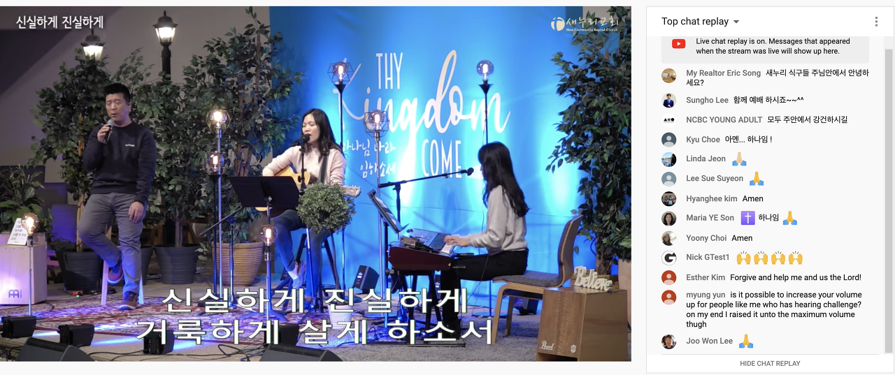 나중에 알게 됐는데, 이 온라인 예배에는 무려 75개국의 사람들이 함께했고, 총 12만개의 서로다른 기기가 접속했다고 (한 기기당 여러명이 예배드릴수 있으니 총 예배 인원은 이를 넘어서는) 한다. 실제 행사는 유투브 라이브 스트림, 페이스북 랑이브, 줌 콜로 동시에 진행되었고, 소수의 모더레이터/리더들은 줌을 통해 서로 이야기하고 나머지는 온라인으로 듣고 채팅으로 참여하는 형식이었다.