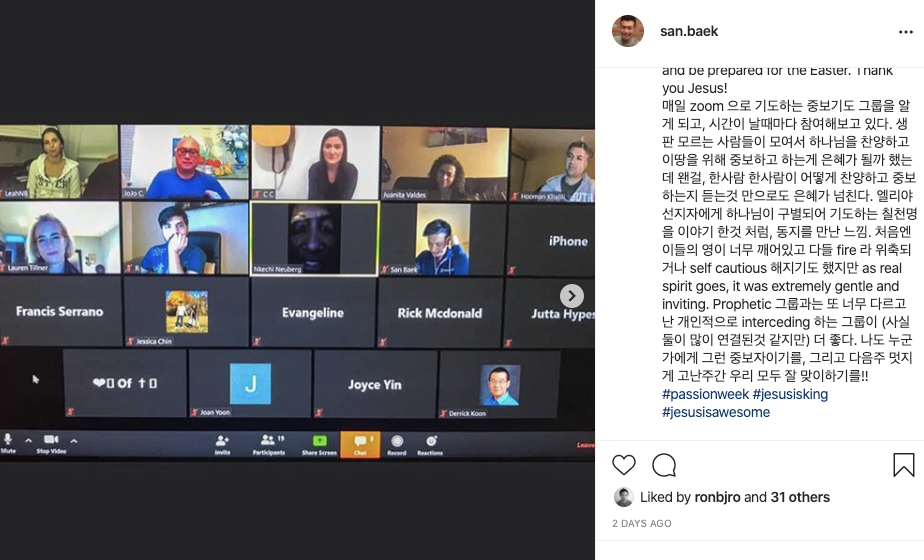 위에 내가 속한 Zoom 기도방 외에도, 정말 수많은 온라인 기도회들이 계속되고 있고, 24-7시간 기도들이 끊임없이 하늘을 향해 올라가고 있다. 마치 구약시대의 성전에서 레위지파들이 계속 끊임없이 성전에서 기도의 끈을 놓지 않고 드린것처럼. 내가 본것만 해도 24-7 Prayer, Burn 24-7 이런것들이 있고, 찾아보면 훨씬 더 많으리라.