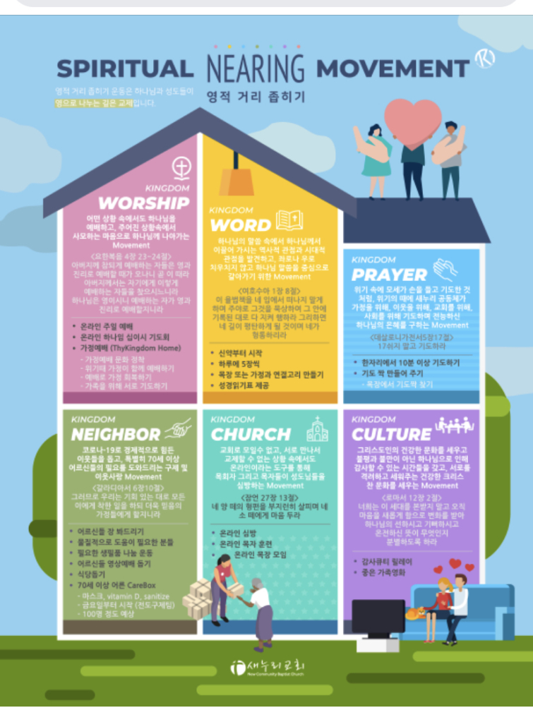 내가 몸담고 있는 새누리교회에서는 사회적 거리두기 (Social distancing) 에 적극 동참하면서, 영적인 거리좁히기 (Spiritual nearing) 움직임을 코로나-19와 함께 시작했다. Kingdom Worship, Kingdom Word, Kingdom Prayer, Kingdom Neighbor, Kingdom Church, Kingdom Culture 라는 크게 여섯가지 축으로, 온라인 예배, 매일 정오에 하는 십이시 기도회, 가정예배를 통해 예배를 세우고 영적으로 더욱 하나가 되자는 움직임이다.