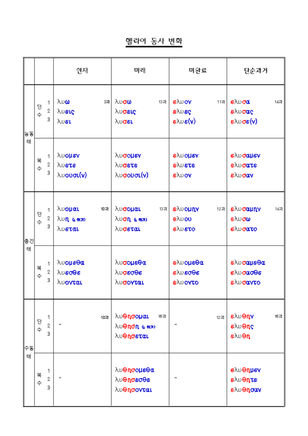 헬라어 세 가지 태(voice) - 능동태, 중간태, 그리고 수동태. *관련 성경 구절; 엡1:4, 빌2:12, 갈 6:7~8,외 *참고 1) 헬라어에는 세 가지 태(voice) - 능동태, 중간태, 그리고 수동태. -능동태와 수동태는 영어와 우리말에서와 똑 같고 중간태는 주어가 어떤 면에서 그 주어 자체에 관계하거나 주어 자체에 속한 무엇에 대하여 동작하는 것을 묘사한다. 드물게나마 중간태가 재귀대명사의 목적격을 가진 영어의 동사 같은 세력을 표현할 때가 있다. 곧 내가 씻다에서 씻다는 동사가 중간태로 쓰이면 내가 나 자신을 씻다가 된다. -그러나 중간태의 세력은 훨씬 더 교묘하여 능동태와 중간태 사이의 차이점을 가려낼 수 없을 때가 자주 있다. 반면에 몇 동사의 경우는 번역할 때 두 가지 뜻이 너무 차이가 많아, 능동태에서 한 동사를 쓰고, 중간태에서는 전혀 다른 동.. 신학/헬라어 2021.06.25